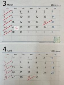 3月20日(金)、4月29日(水)祝日の為、お休みです。